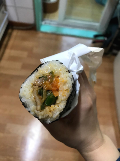 오 기대했던것보다 괜찮았음. 고기도 크고 상추, 당근, 삼겹살,고추, 쌈장이 들어있음. 예전에 삼겹살 김밥을 집에서 만들어본 기억이 있는데 역시 고기는 사랑임.